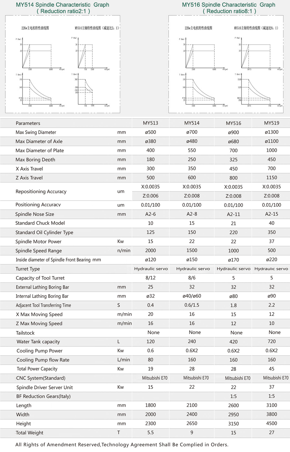 The machine features MY514, MY516, MY519 Structural features: one-piece casting structure, linear guideway, vertical (horizontal) servo turret. Machine advantage: rapid traverse speed, high machining accuracy, good rigidity, smooth chip removal, high reliability, good versatility. Be fit for machining all kinds of plate/disk and short axle/shaft within machine's technical specification.